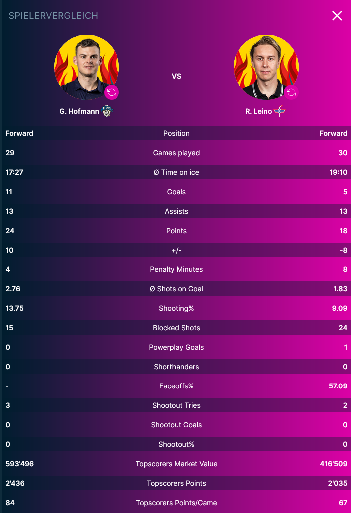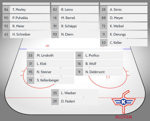 Die jeweiligen Topscorer am heutigen Abend sind auf Seiten des Heimteams Stürmer Gregory Hofmann (24 Punkte davon 11 Tore und 13 Assists). Bei den Gästen aus Kloten trägt mit Robert Leino (18 Punkte davon 5 Tore und 13 Assists) ebenfalls ein Stürmer den Flammenhelm.