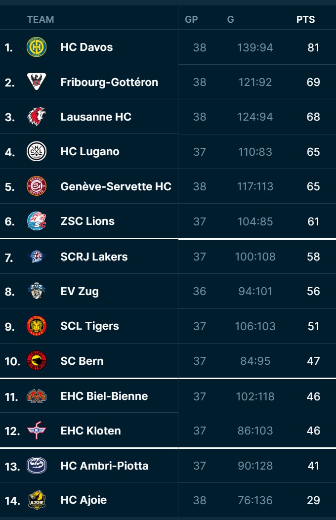 Es ist ein Duell auf Augenhöhe zwischen zwei direkten Tabellennachbarn. Genève-Servette steht nach 38 Spielen bei 65 Punkten auf Platz fünf, der HC Lugano mit einer Partie weniger ebenfalls bei 65 Zählern auf Rang vier. Die Ausgangslage verspricht Hochspannung: Mit einem Sieg könnten die Bianconeri zu Lausanne aufschliessen. Gleichzeitig lauern die ZSC Lions mit 61 Punkten knapp dahinter und erhöhen den Druck auf beide Teams zusätzlich.