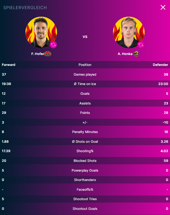 Auf Seiten des Heimteams trägt Anttoni Honka den Flammenhelm. Der Finne hat bisher mit 5 Toren und 23 Assists 28 Scorer gesammelt. Beim Gast aus Biel hat Fabio Hofer mit 12 Toren und 17 Assists insgesamt 29 Scorer zu Buche stehen.
