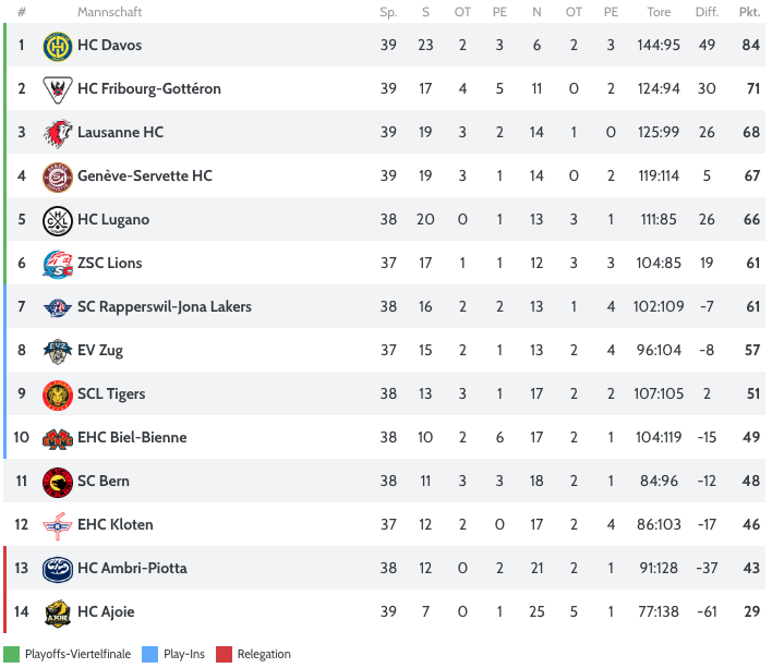 Der Lausanne HC steht nach 39 gespielten Spielen auf dem dritten Rang in der Tabelle. Eine grosse Stärke des Westschweizer Teams ist die Offensive, mit 125 Toren haben sie die zweitmeisten Tore geschossen. Defensiv bewegen sie sich im Mittelfeld der Liga, 99 Treffer haben die Lausanner Löwen erhalten.