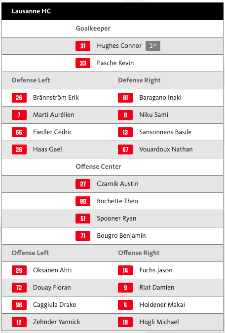 Im Tor steht beim Lausanne HC heute Connor Hughes, Kevin Pasche nimmt auf der Bank Platz. Die Verteidigung hat heute vier Linien, Basile Sansonnens kommt heute zusätzlich in die Aufstellung im Vergleich zu gestern. In der Offensive ändert sich wenig, nur Kelyan Barry fehlt heute, weil er Platz für Sansonnens macht.