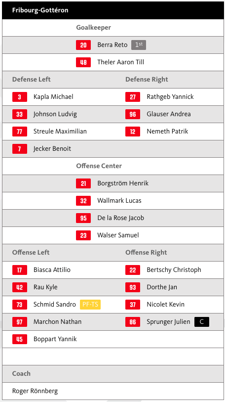 Wie bereits am Donnerstag steht auch heute Reto Berra im Kasten, auf der Bank nimmt Aaron Theler Platz. Bei den Feldspielern ändert sich nominell nichts, einzig die Linie Biasca, Borgström, Bertschy übernimmt heute die erste Position. Rau, Wallmark und Dorthe übernehmen dafür die Rolle als zweite Offensivlinie.