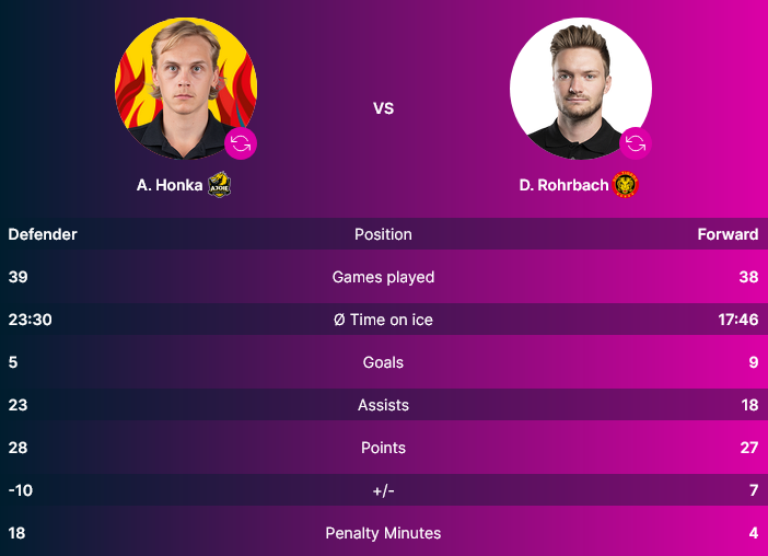 Schauen wir noch zu guter Letzt auf die beiden Topscorer am heutigen Abend. Auf Seiten des Heimteams ist es Anttoni Honka (28 Punkte davon 5 Tore und 23 Assists) und beim Gast aus dem Emmental trägt Dario Rohrbach, in Vertretung des weiter verletzten Andre Petersson, (27 Punkte davon 9 Tore und 18 Assists) den Flammenhelm.