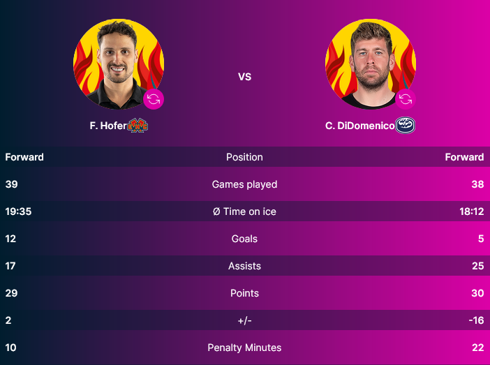 Schauen wir noch zu guter Letzt auf die beiden Topscorer am heutigen Abend. Auf Seiten des Heimteams ist es Fabio Hofer (29 Punkte davon 12 Tore und 17 Assists) und beim Gast aus dem Nord-Tessin trägt Chris DiDomemico (30 Punkte davon 5 Tore und 25 Assists) den Flammenhelm.